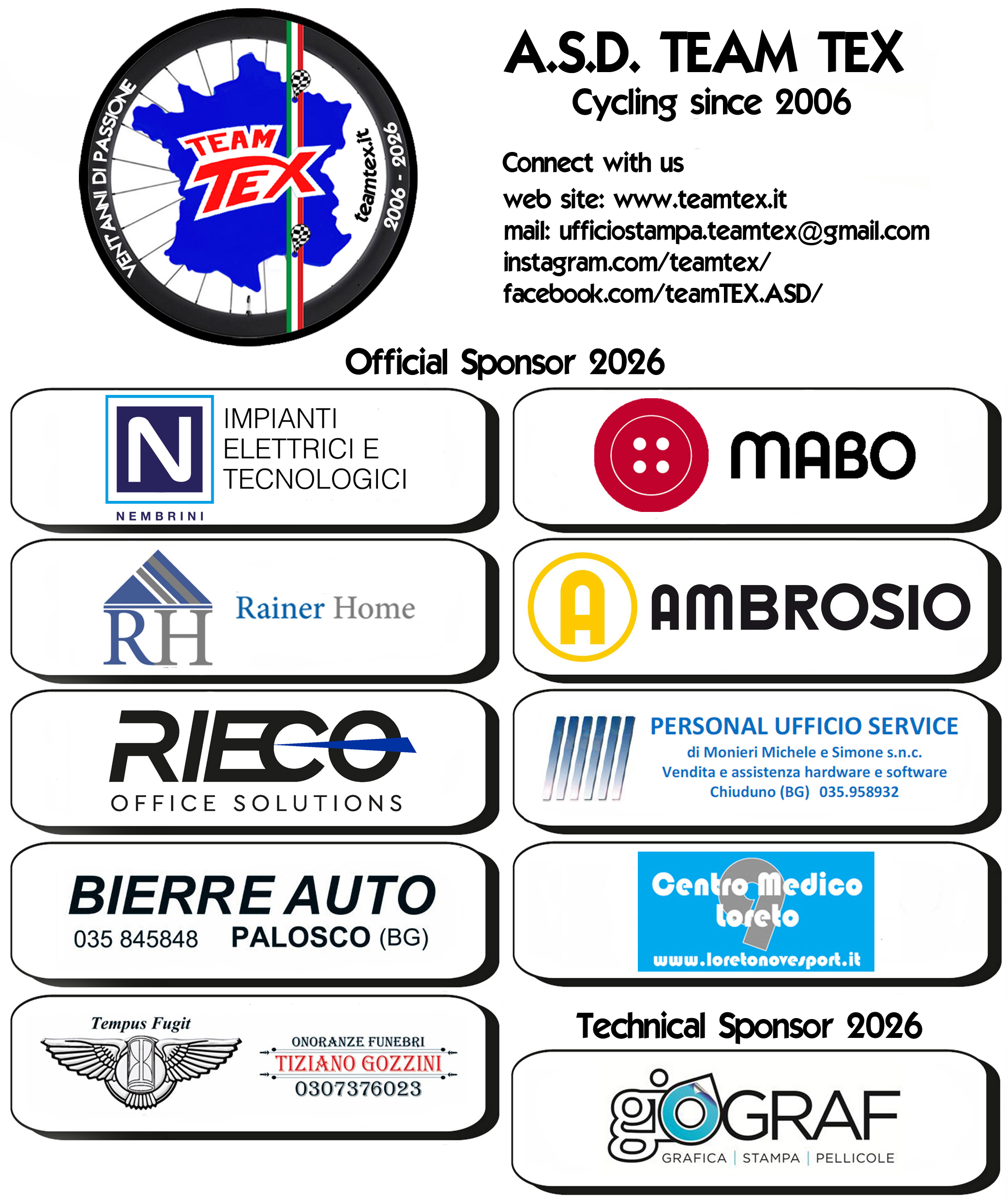 In queste giornate non conta soltanto il cronometro. Conta il sorriso di un bambino al via, l’applauso dei genitori a bordo pista, l’orgoglio di indossare un numero sulla schiena per la prima volta. È lì che il Team TEX riconosce la propria missione più autentica: coltivare sogni su due ruote e accompagnarli, pedalata dopo pedalata, verso il futuro.Dal 2006 il Team TEX “pedala” anche on-line, attraverso il sito ufficiale www.teamtex.it dove oltre ad una bacheca con appuntamenti e notizie, è presente la pagina “sponsor” con i collegamenti alle rispettive pagine delle aziende che supportano il team nelle sue attività di promozione del ciclismo e che ringraziamo per la loro fiducia e supporto.